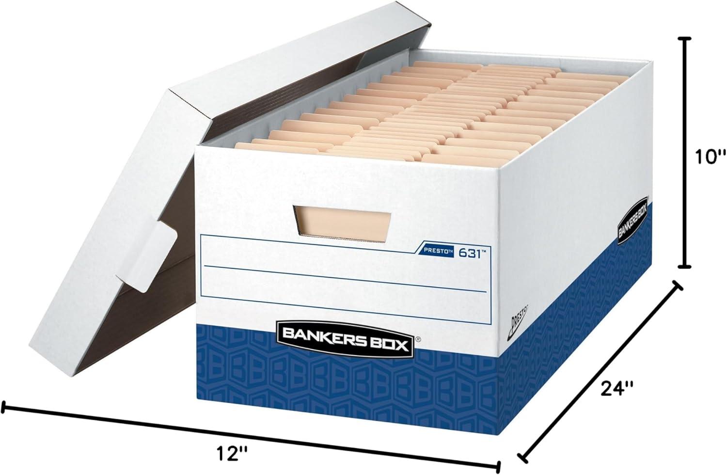 Instant Assembly – just push corners together and the box is ready for use. Heavy-duty, double end, double side, double bottom construction for stacking, storage, and transport you can trust. Reinforced tear-resistant hand holes make box comfortable to carry. Deep, locking lift-off lid stays in place for secure file storage.