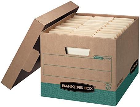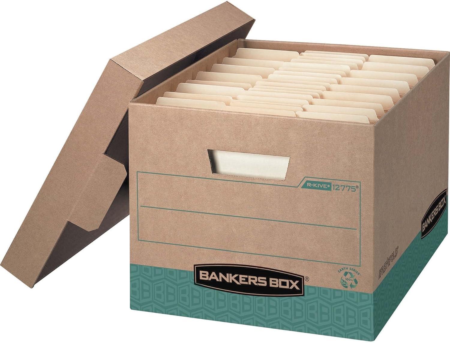 Heavy-duty, triple end, double side, double bottom construction stacks up stronger and withstands frequent handling. FastFold® quick and easy assembly. Reinforced tear-resistant hand holes make box comfortable to carry. Deep, locking lift-off lid stays in place for secure file storage. Smooth rolled edges add strength and prevent paper cuts.