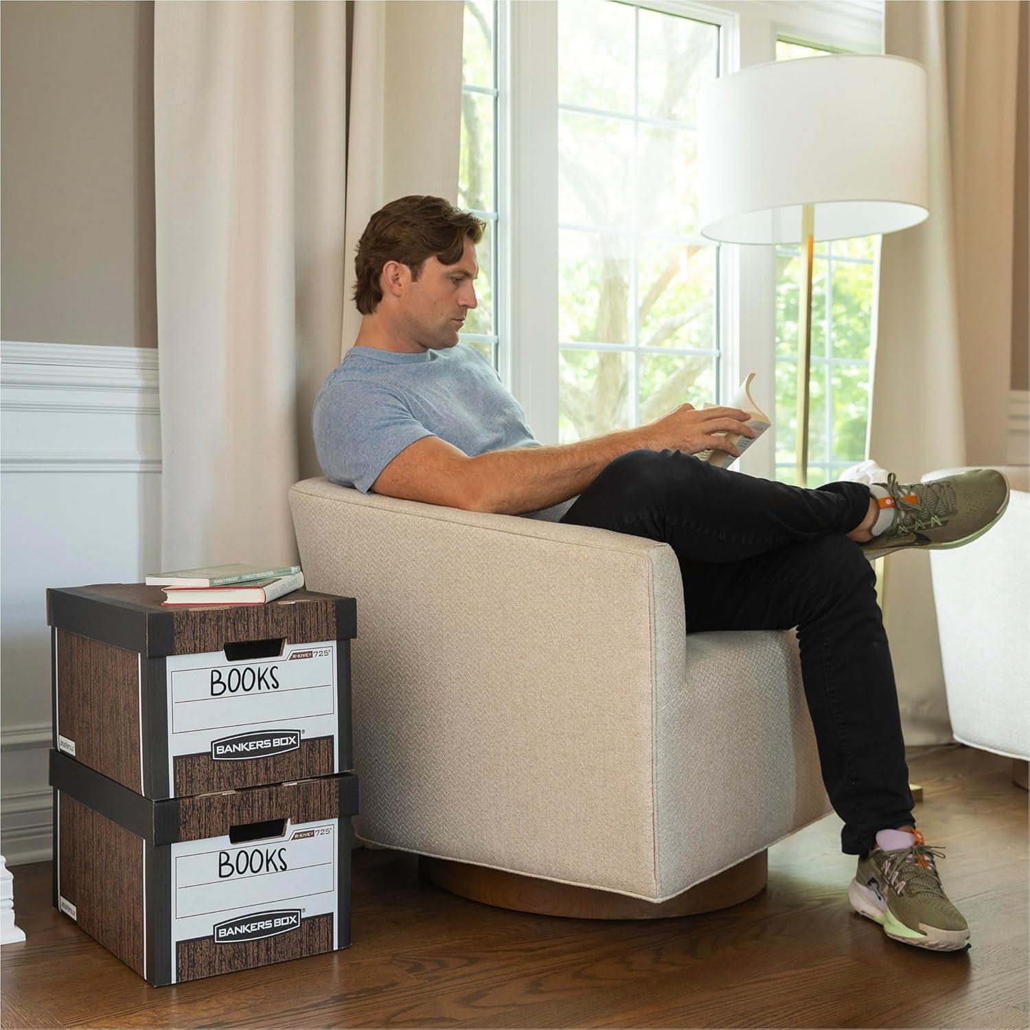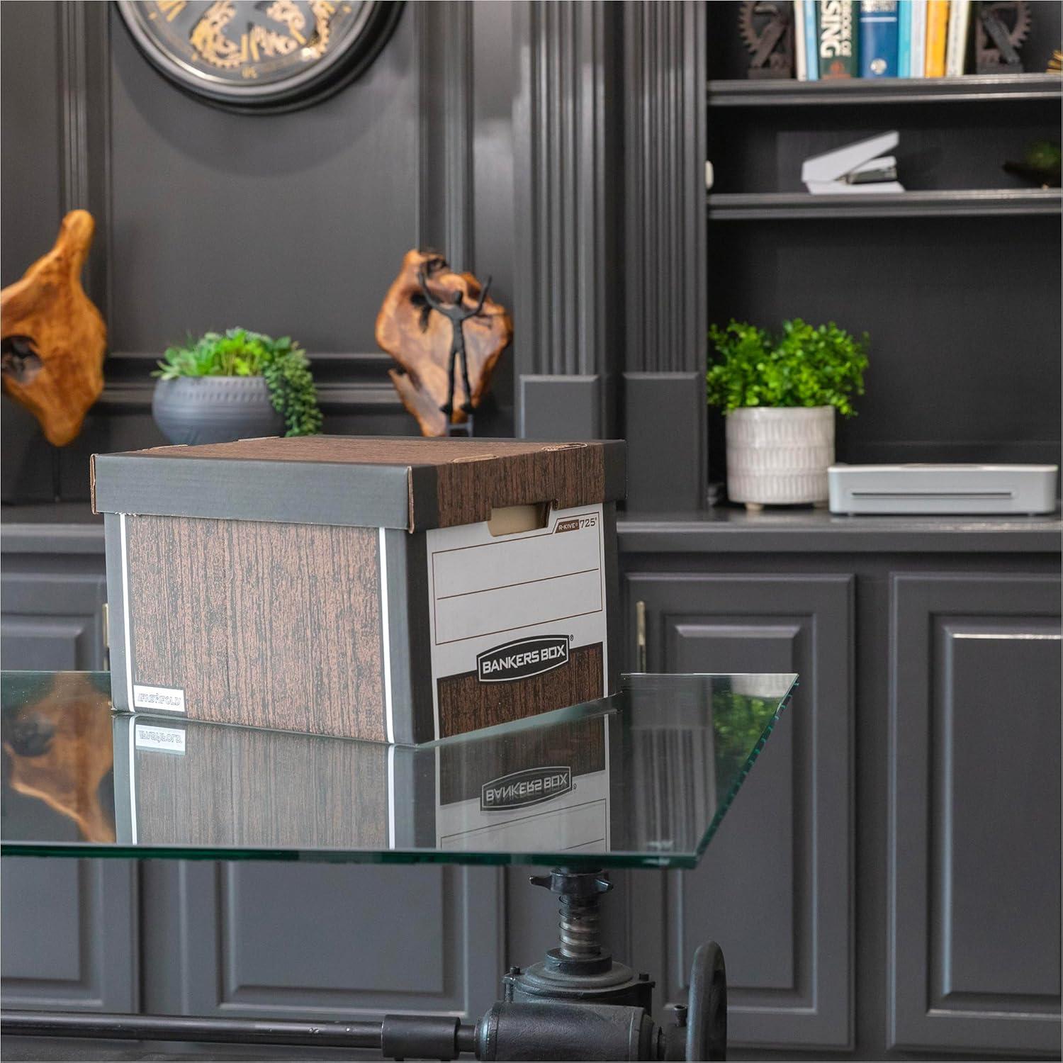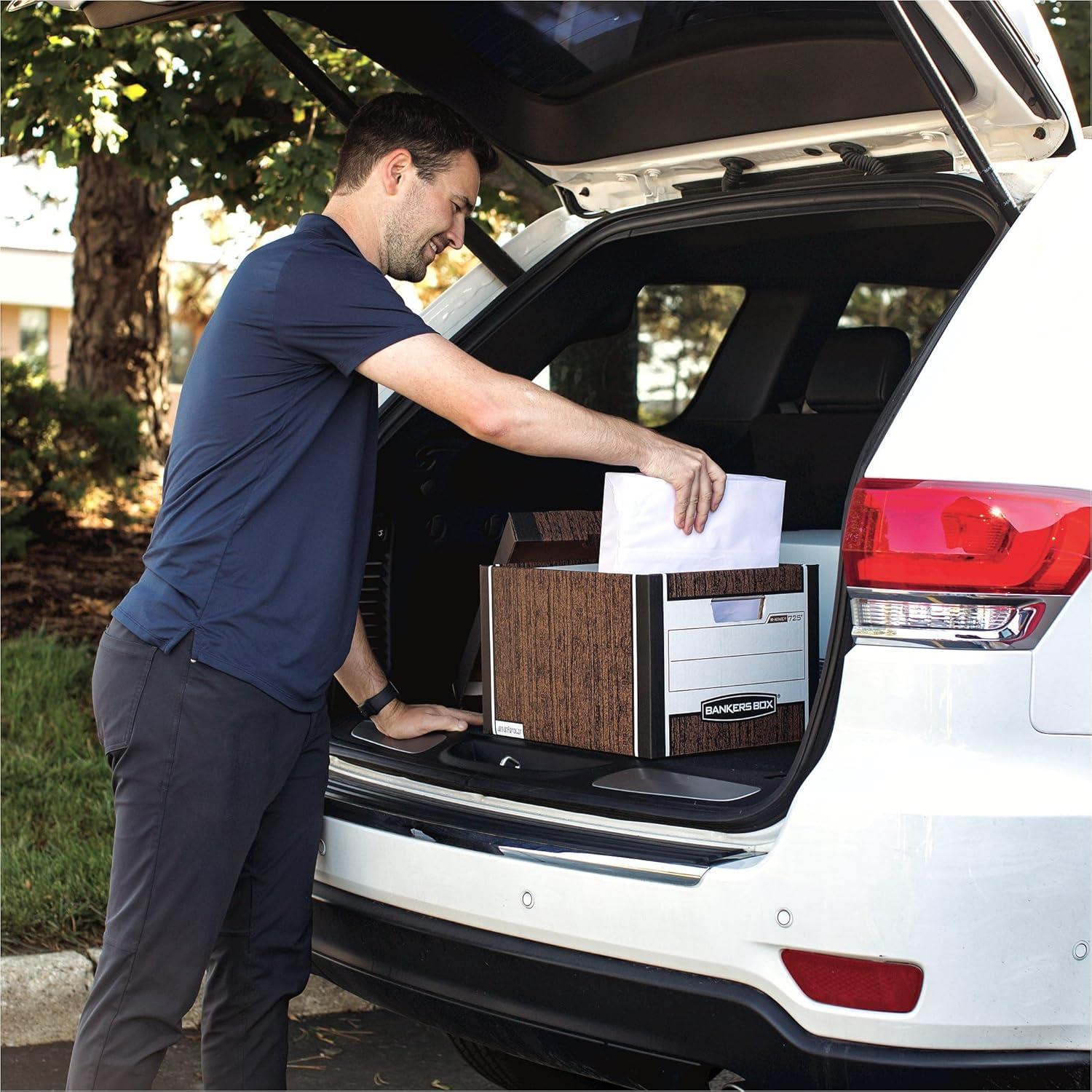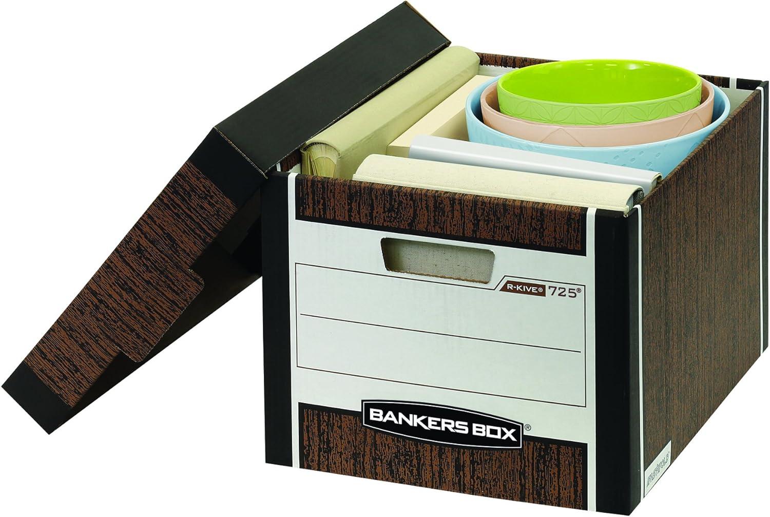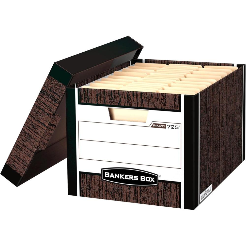 Fellowes Bankers Box R-Kive Storage Boxes offer FastFold quick-and-easy assembly. The heavy-duty, triple-end, double-side, double-bottom construction provides strength and durability. Reinforced, tear-resistant hand holes make the box comfortable to carry. The deep, locking, lift-off lid stays in place for secure file storage. Smooth rolled edges add strength and prevent paper cuts. The R-Kive Storage Boxes provide convenient, secure storage for all your important documents.