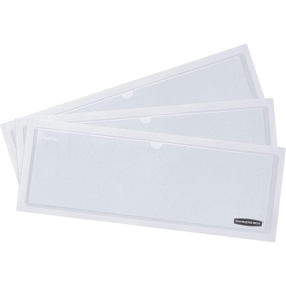 The self-adhesive label pocket made from clear PVC – won’t crack or peel! simply slip label into label pocket for quick, easy identification of storage boxes. Perfectly sized to fit labeling area on all Bankers Box storage boxes. Easily change the label again and again! 48 white label inserts included.
