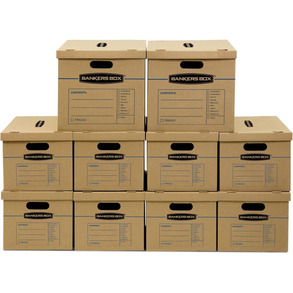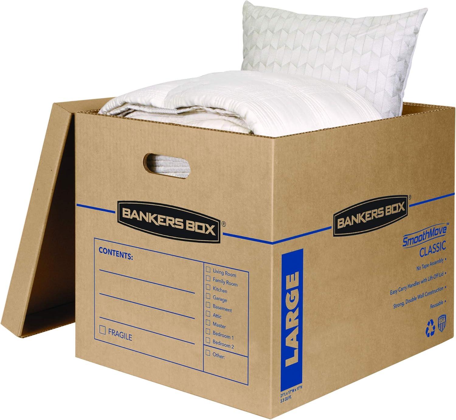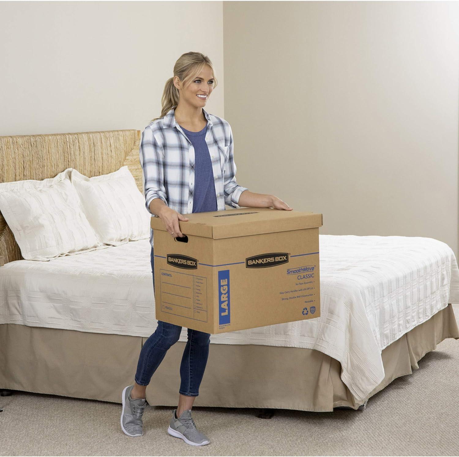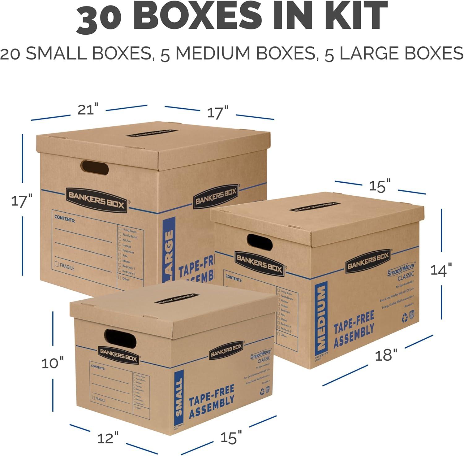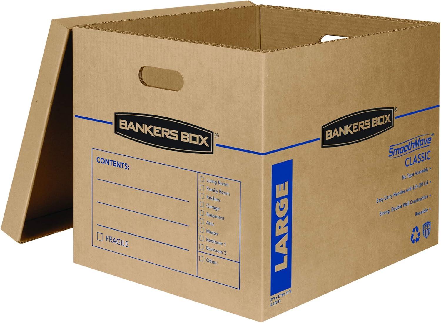 Bankers Box smoothmove no tape easy set up classic moving box value 30 boxes. Easy set-up – no tape required for box assembly. Convenient lift-off lid. Easy carry handles. Durable, double end, double bottom construction. Constructed from strong 32 ECT b-flute kraft corrugated board. Reusable, recyclable and made in the USA.