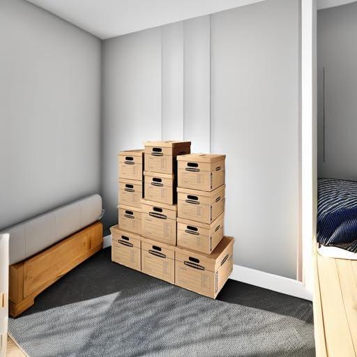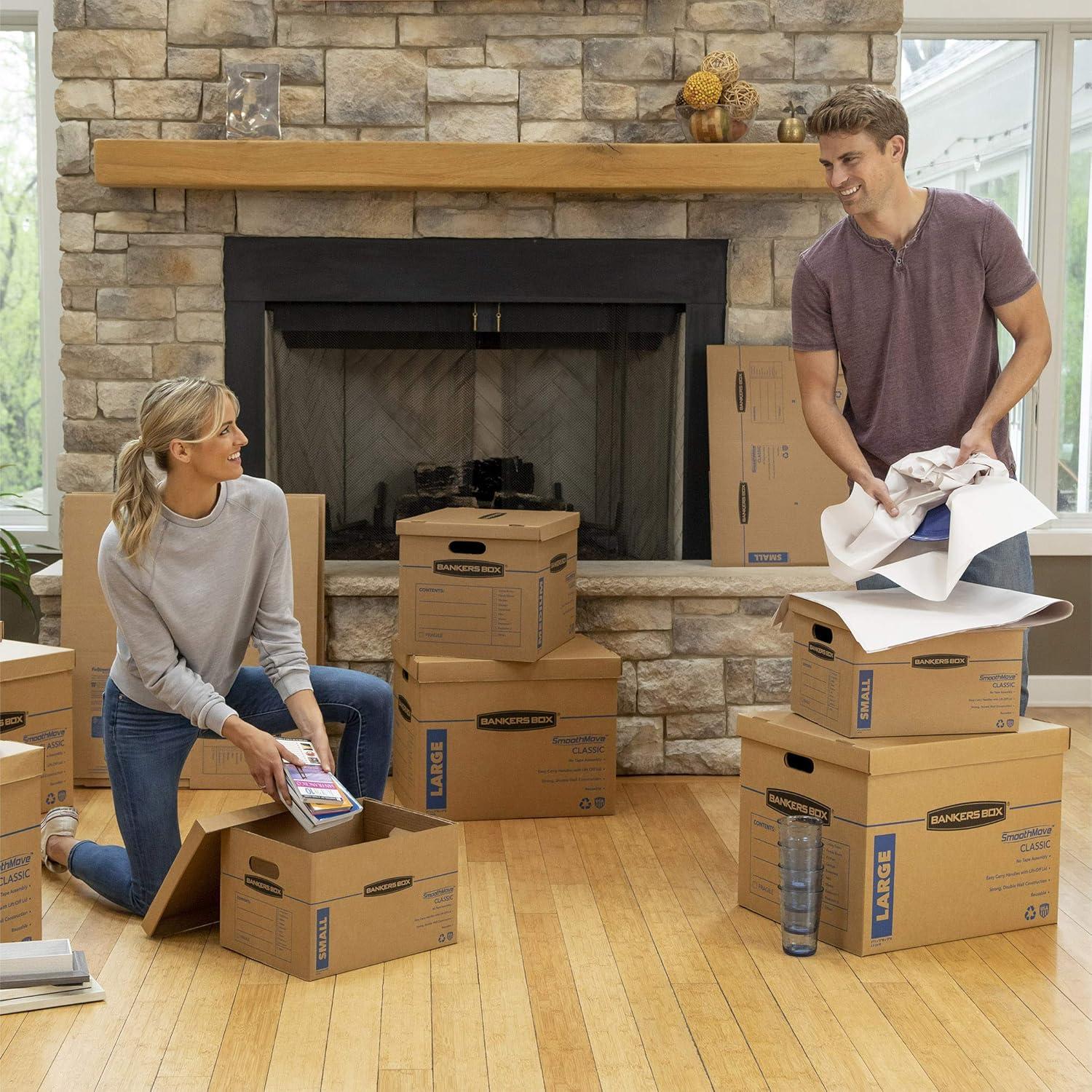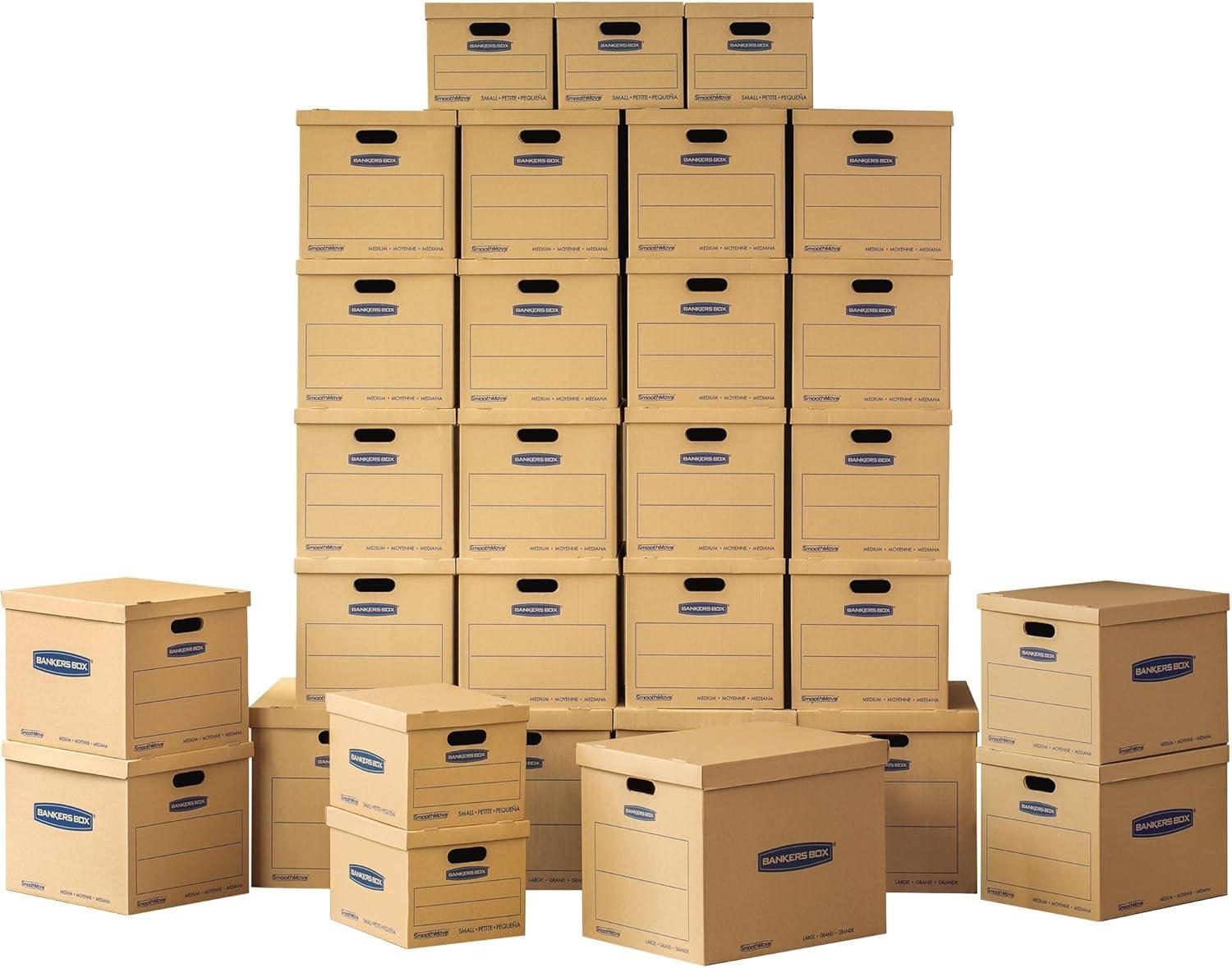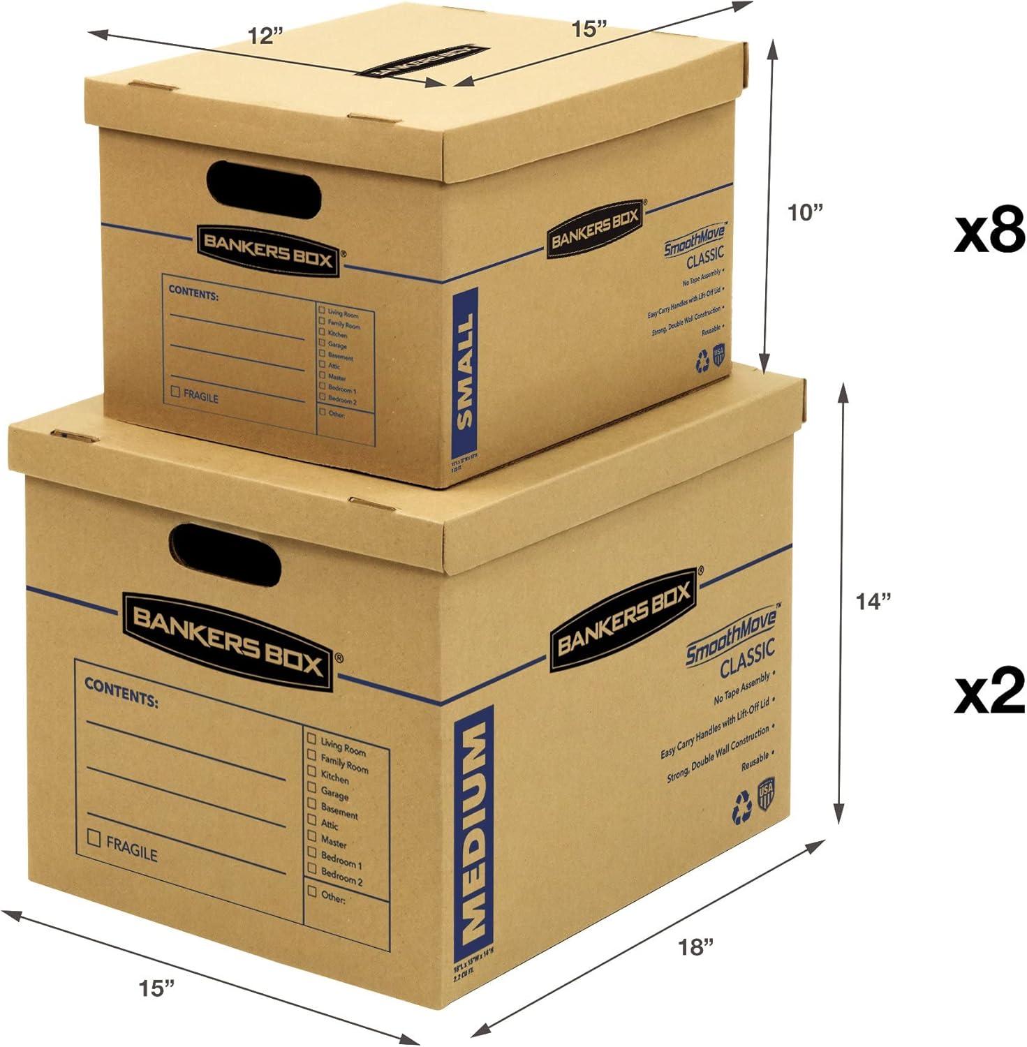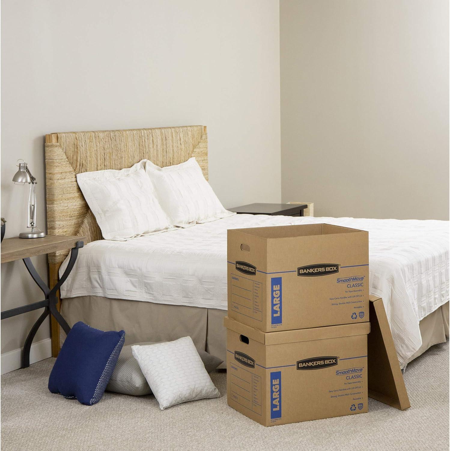 Bankers Box smoothmove no tape easy set up classic moving box value 30 boxes. Easy set-up – no tape required for box assembly. Convenient lift-off lid. Easy carry handles. Durable, double end, double bottom construction. Constructed from strong 32 ECT b-flute kraft corrugated board. Reusable, recyclable and made in the USA.
