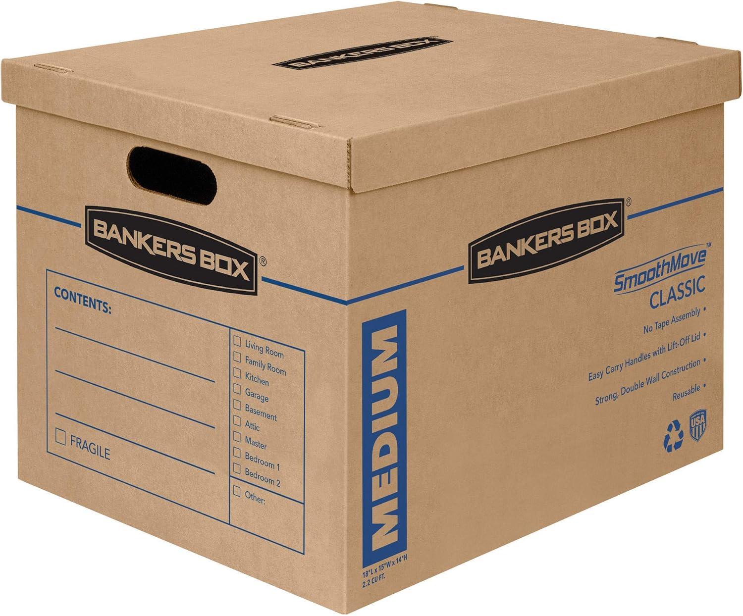 Bankers Box SMOOTHMOVE no tape easy set up classic moving box value 30 boxes. Easy set-up – no tape required for box assembly. Convenient lift-off lid. Easy carry handles. Durable, double end, double bottom construction. Constructed from strong 32 ECT B-Flute Kraft corrugated board. Reusable, recyclable and made in the USA.