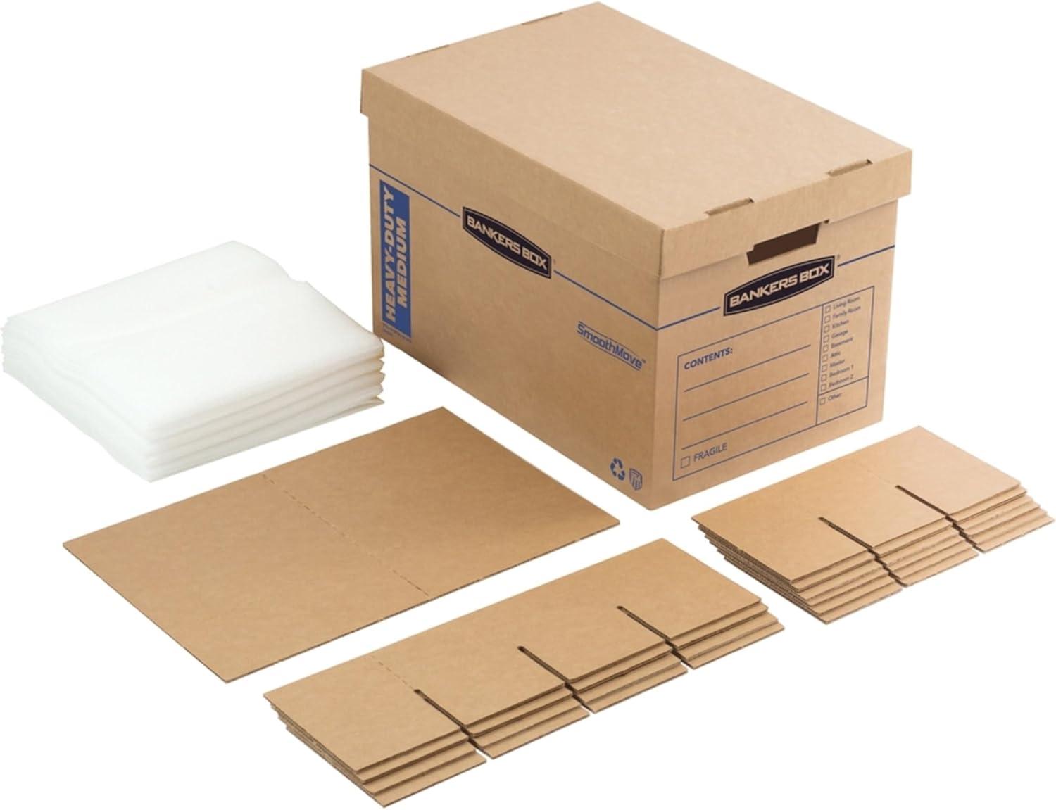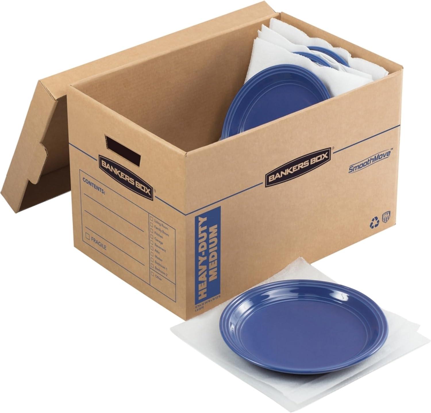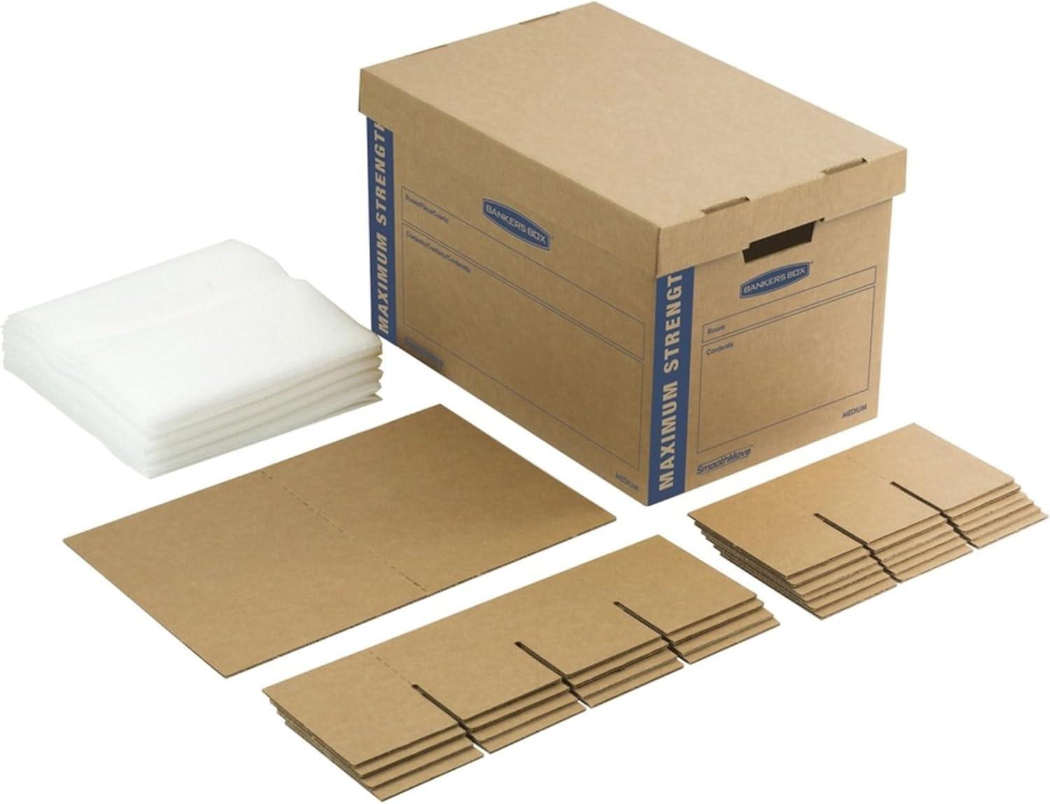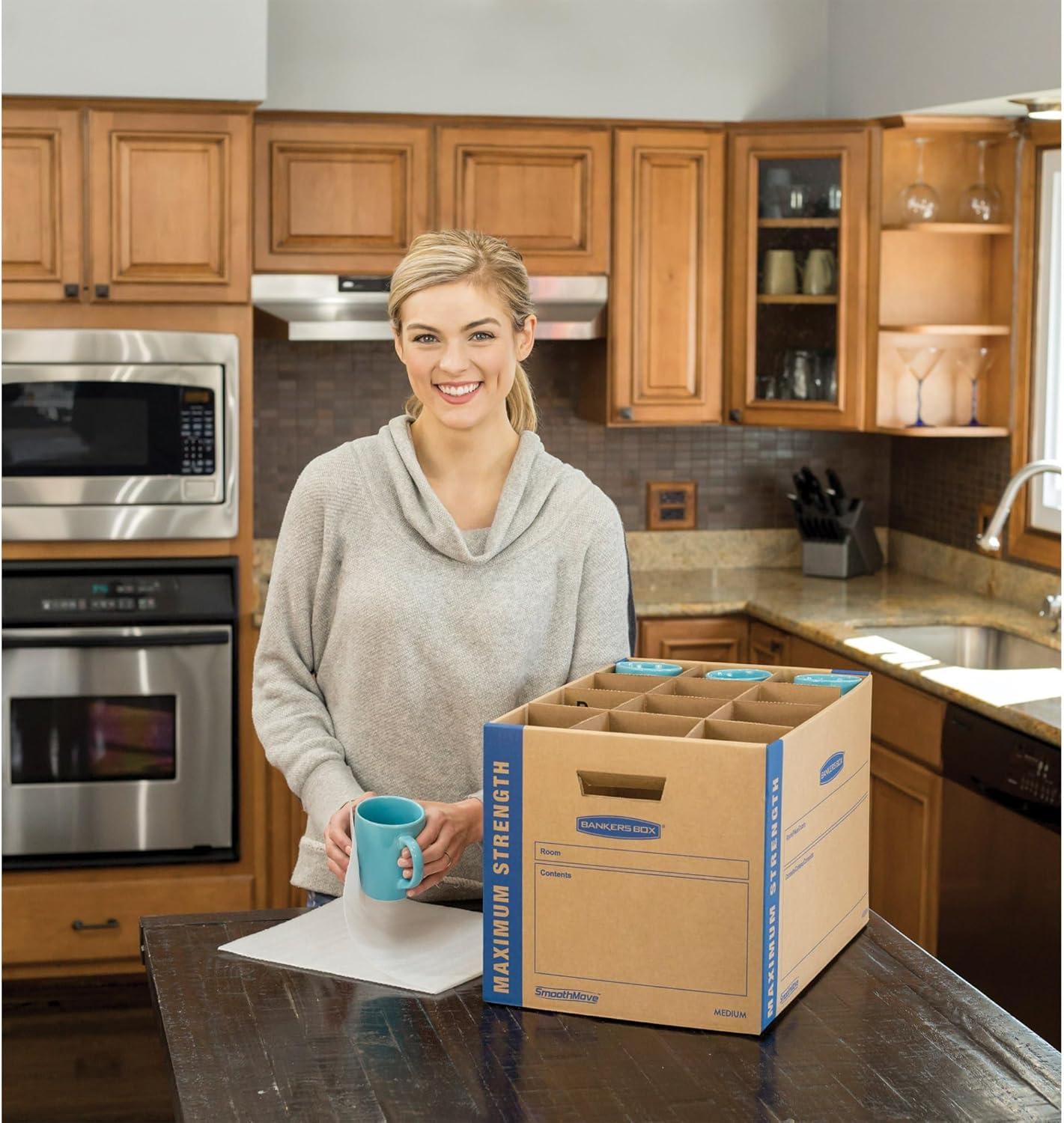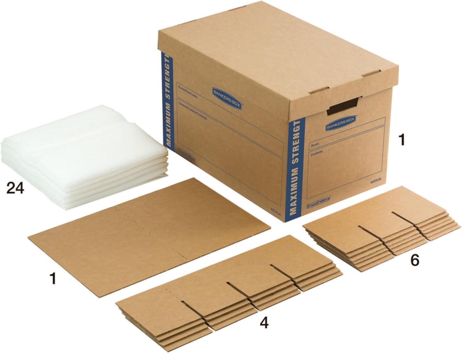 The Bankers Box SMOOTHMOVE kitchen moving kit features a maximum strength design with triple end, double side, double bottom construction for protecting fragile kitchen items. The kit includes 24 divider pieces for Glasses and stemware and 24 ft. Of foam for cushioning all delicate items. Perforated dividers make for easy, customizable packing. The kit features fast fold quick and easy to assembly with no tape required. The deep locking lift-off lid provides secure closure and the labeling area on the box designates the contents inside to keep your move organized.