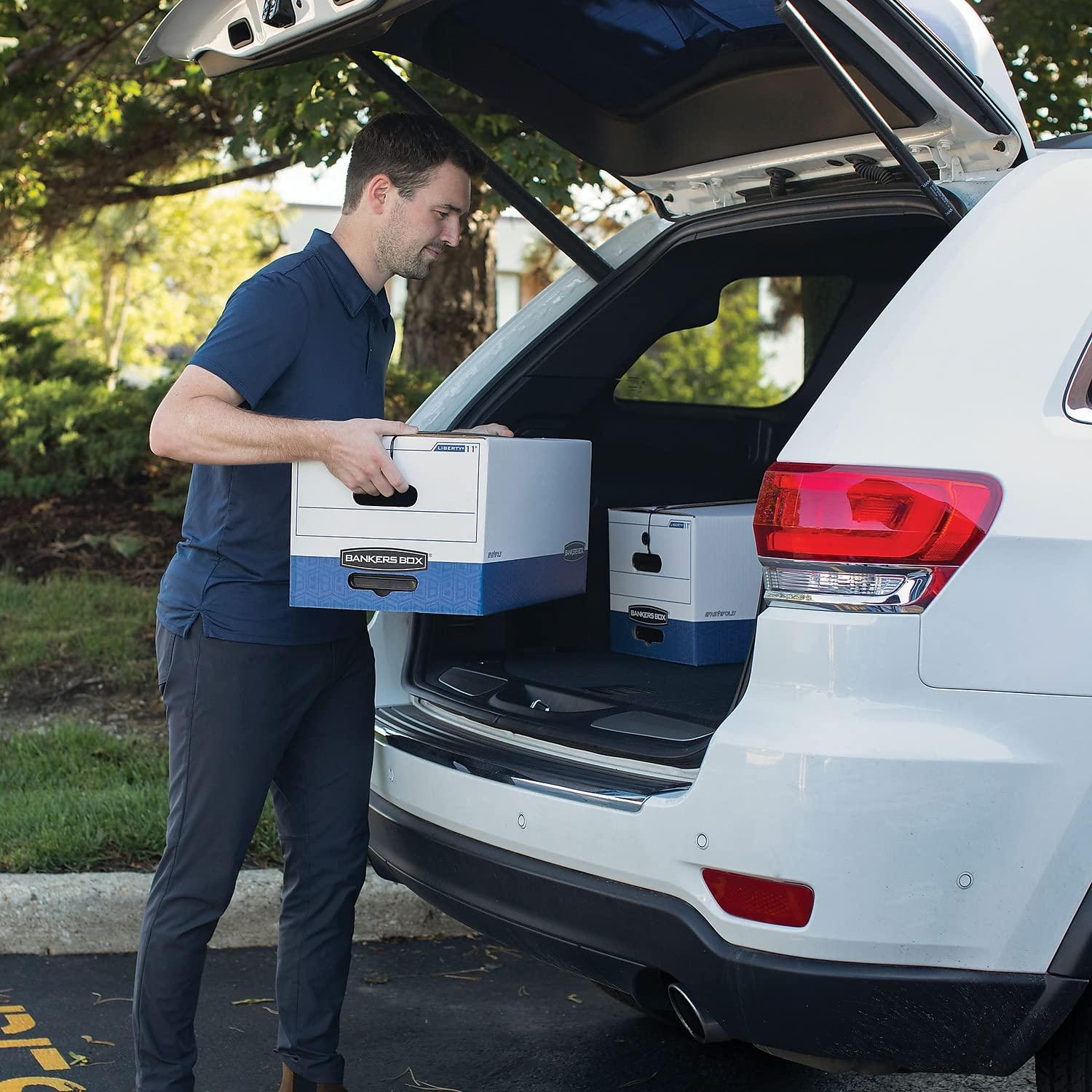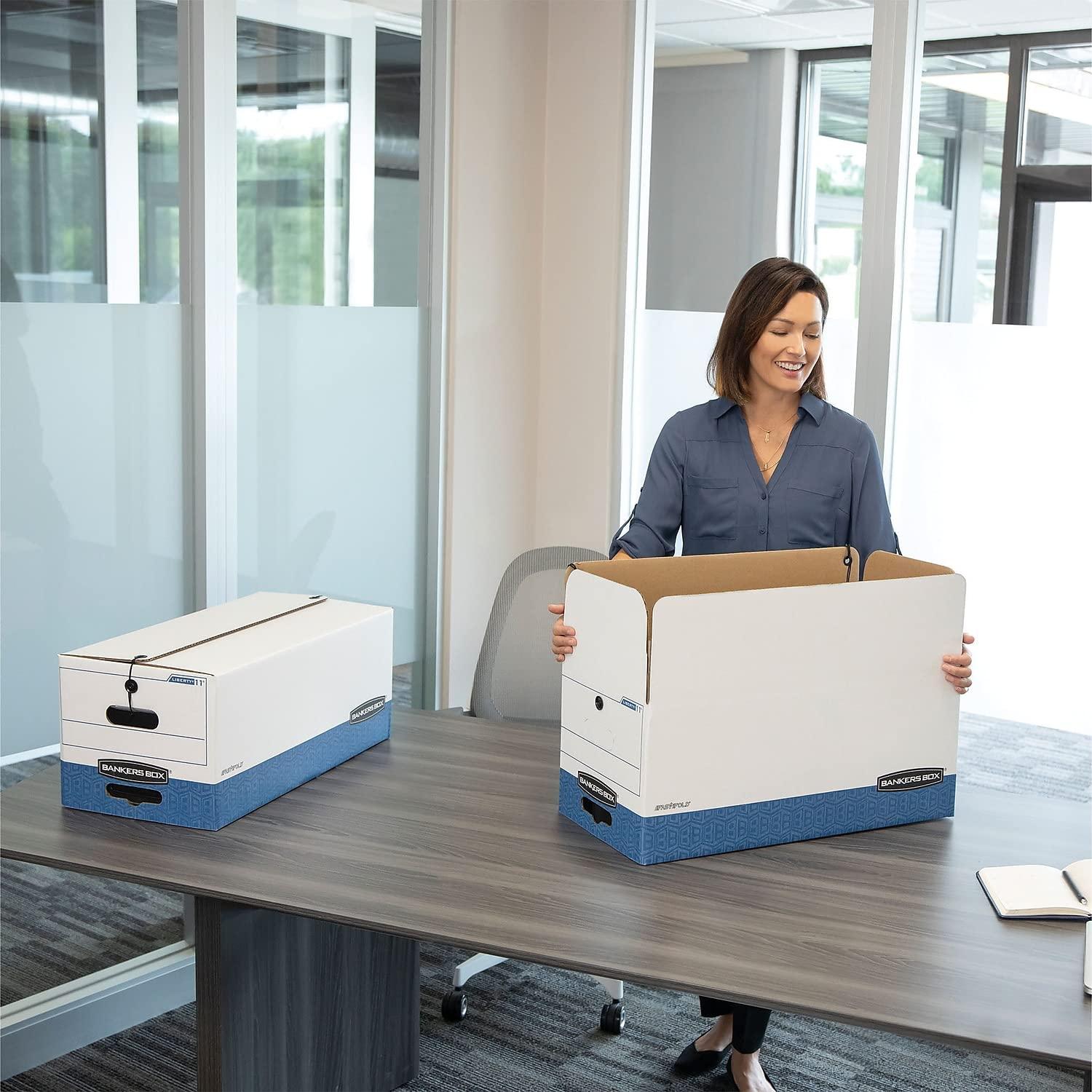 Maximum security box with string & button closure keeps contents secure, even when box is overturned. Up to 50% stronger than other string & button boxes for stacking without shelving. FastFold® quick and easy assembly. Reinforced plastic handle makes it easy to pull box off shelving.