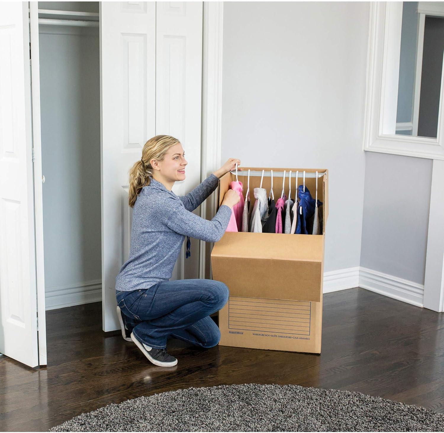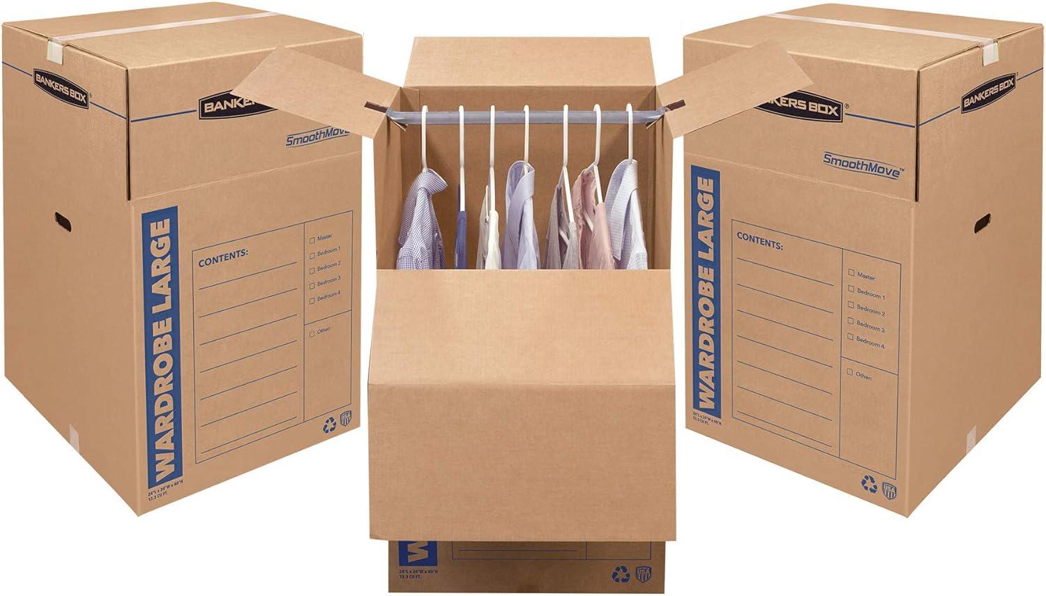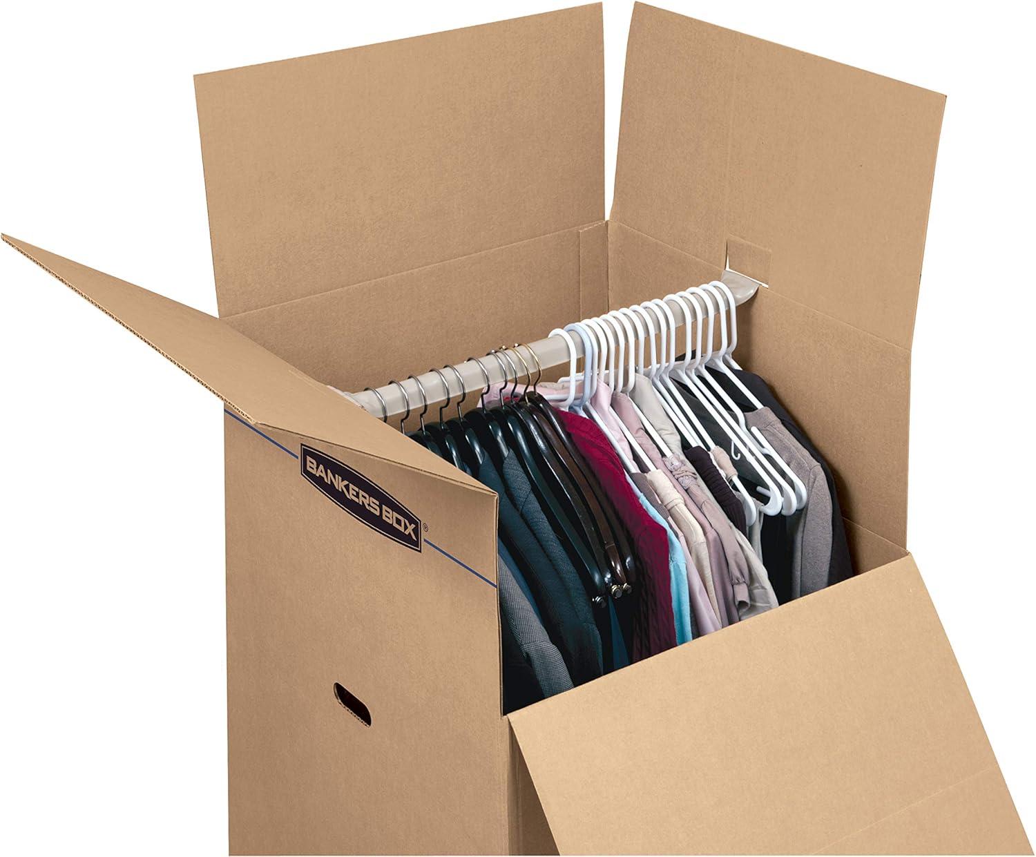 Bankers Box SMOOTHMOVE WARDROBE Box Short 20x20x34 3pk. Wardrobe boxes are designed specifically for moving and storage of hanging items. Each box includes a 20″ hanger bar which can accommodate up to 2 linear feet of closet items. The wardrobe box closes completely to keep articles clean. Boxes are constructed from stronger 44 ECT C-Flute Kraft corrugated board and are reusable and recyclable. The actual assembled size of one box is 20 x 20 x 34 Inches.