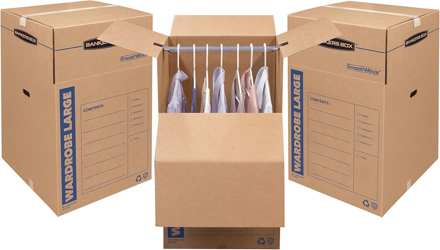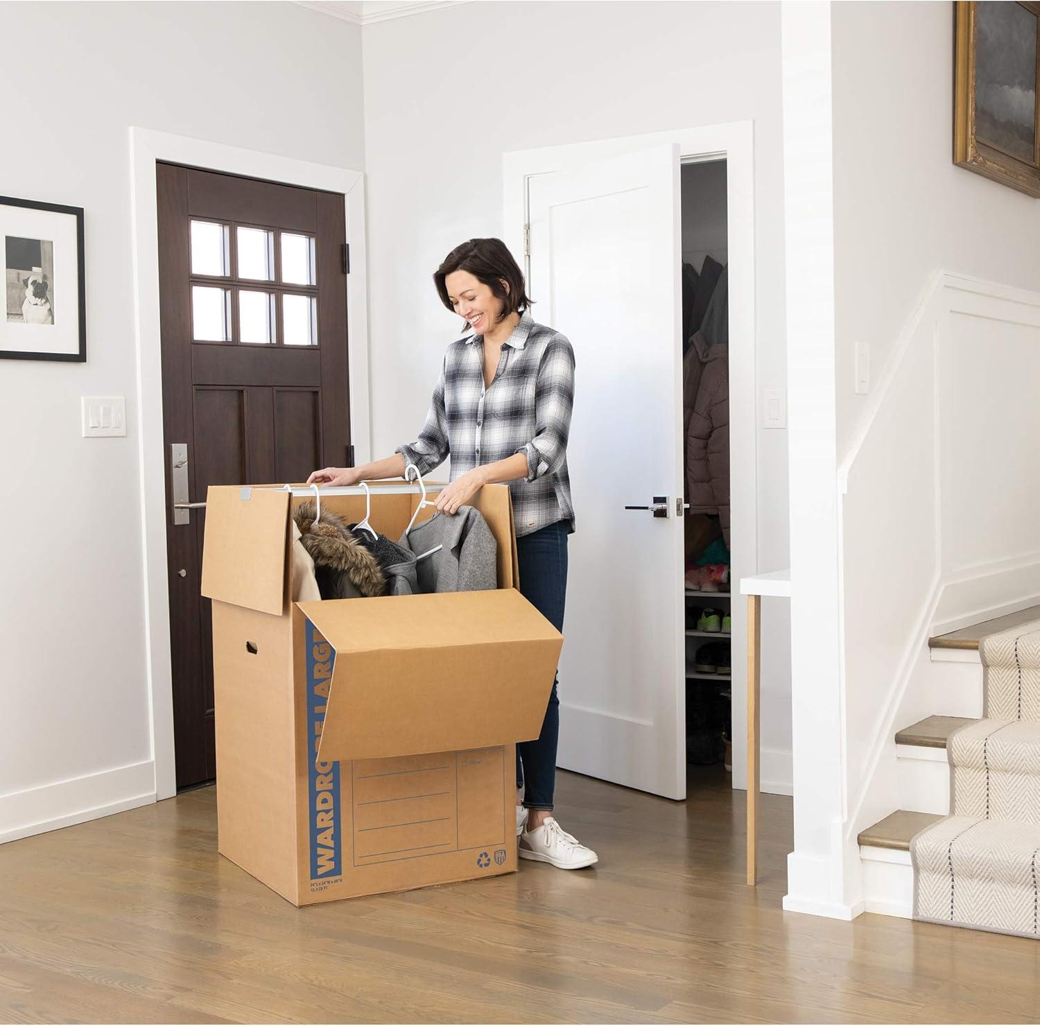 Wardrobe boxes are designed specifically for moving and storage of hanging items. Each box includes a 24″ Hanger bar Which can accommodate up to linear feet of closet items. The wardrobe Box closes completely to keep articles clean. Boxes are constructed from stronger 44 ECT C-Flute Kraft corrugated board and are reusable and recyclable. The actual assembled size of one box is 40.25 x 24.38 x 24.38 inches while the dimensions for the package of 3 boxes as delivered to the doorstep is 25.1 x 41.6 x 17.4 inches.